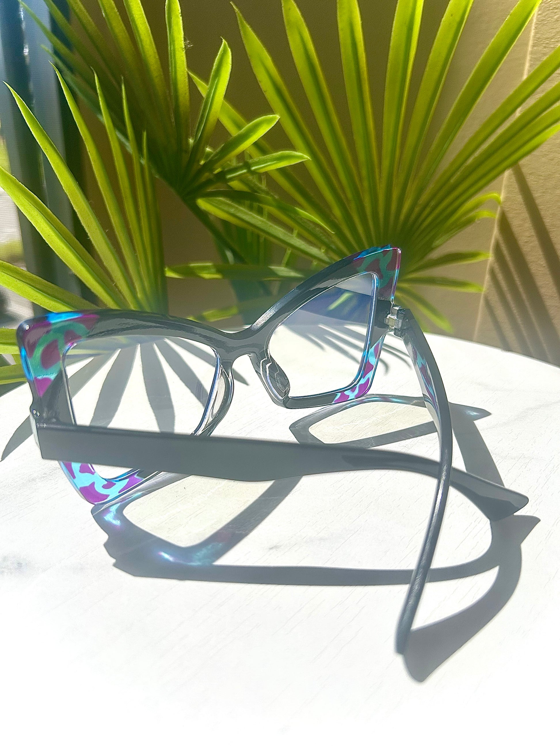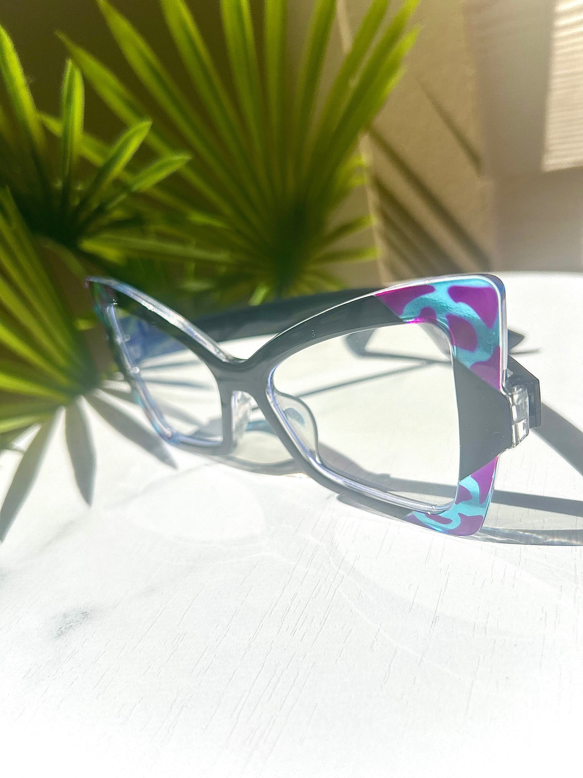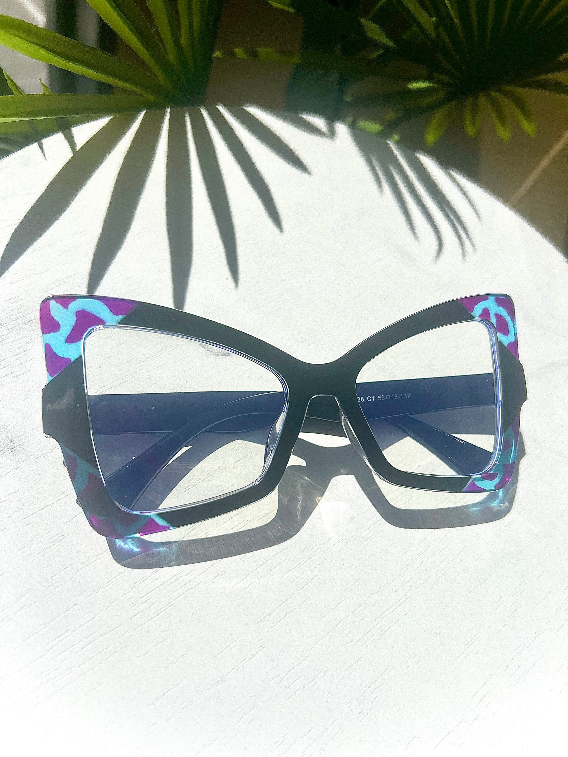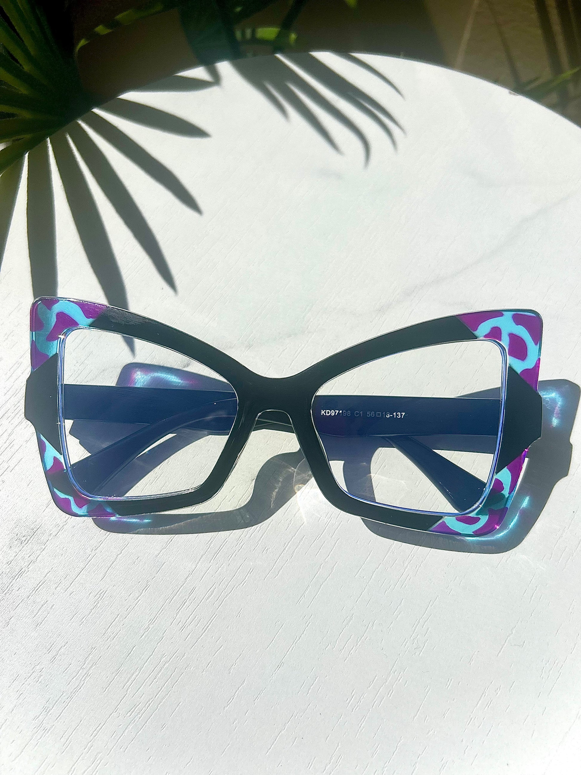 Turn heads in these bold black and purple oversized cat-eye glasses. With their geometric angles and vibrant accents, these frames are the ultimate statement piece for any fashion-forward look. Perfect for everyday wear, photoshoots, or accessorizing your outfits with a pop of personality. Lightweight yet durable, these glasses are designed for comfort and long-lasting style.