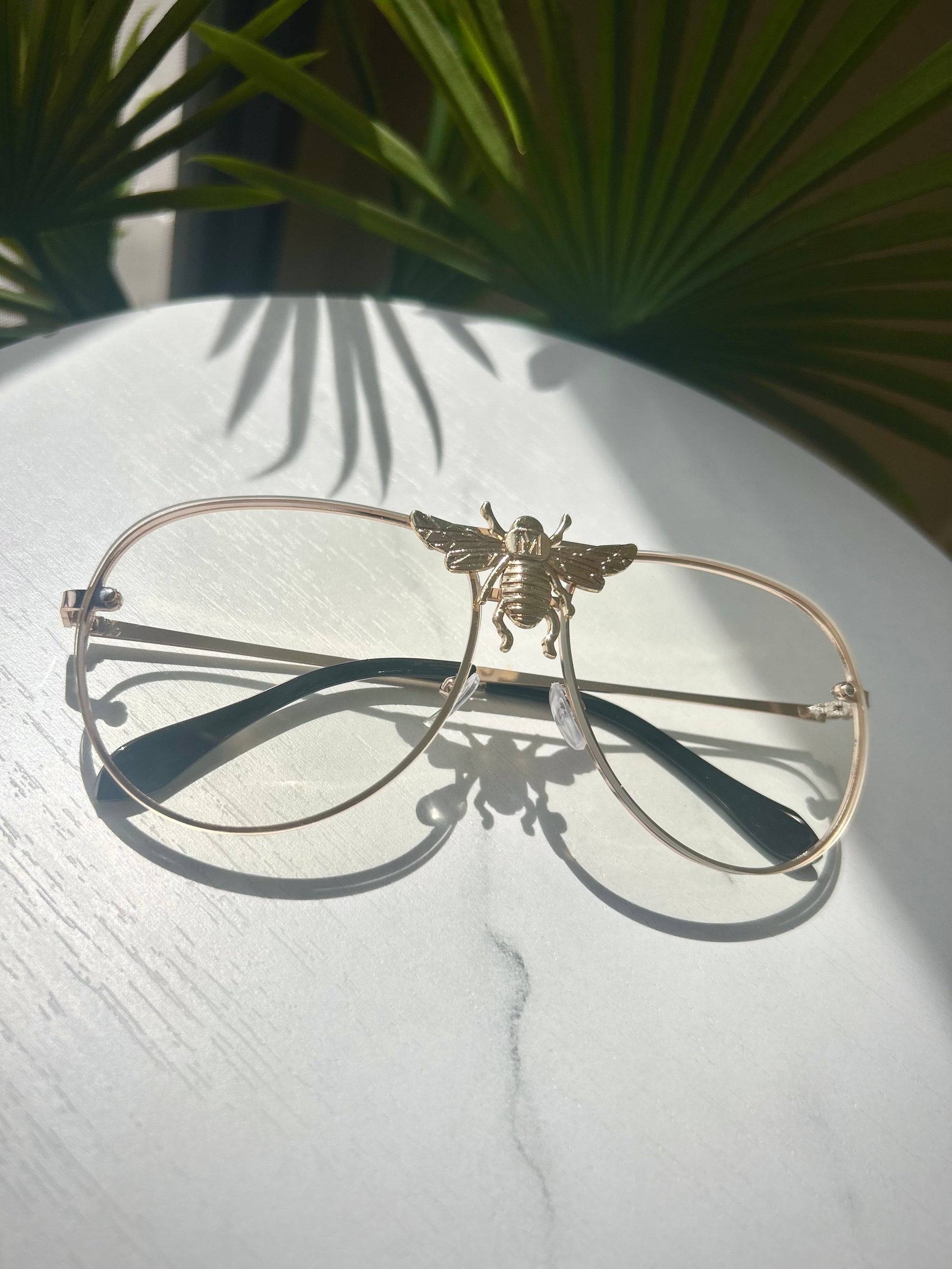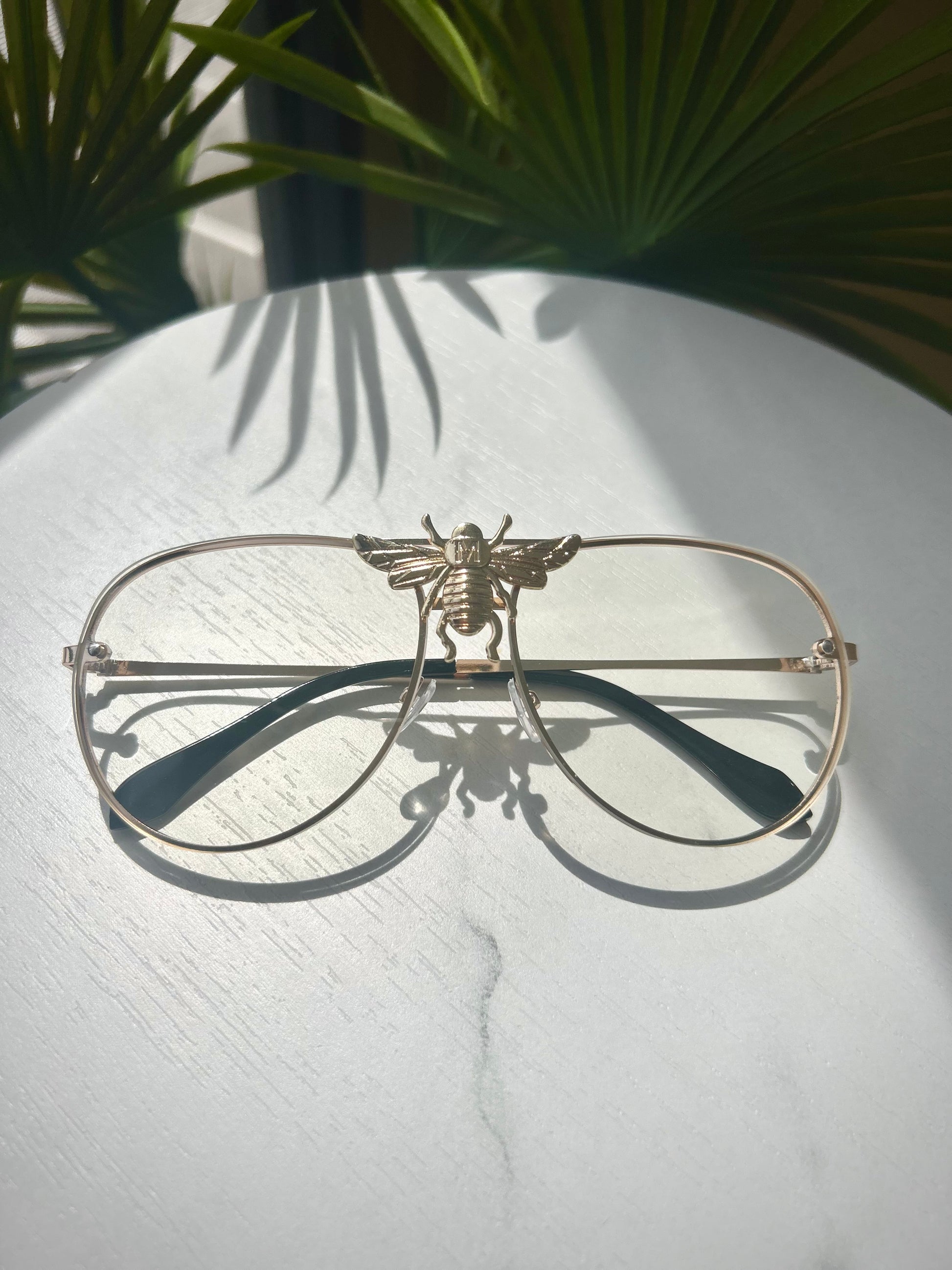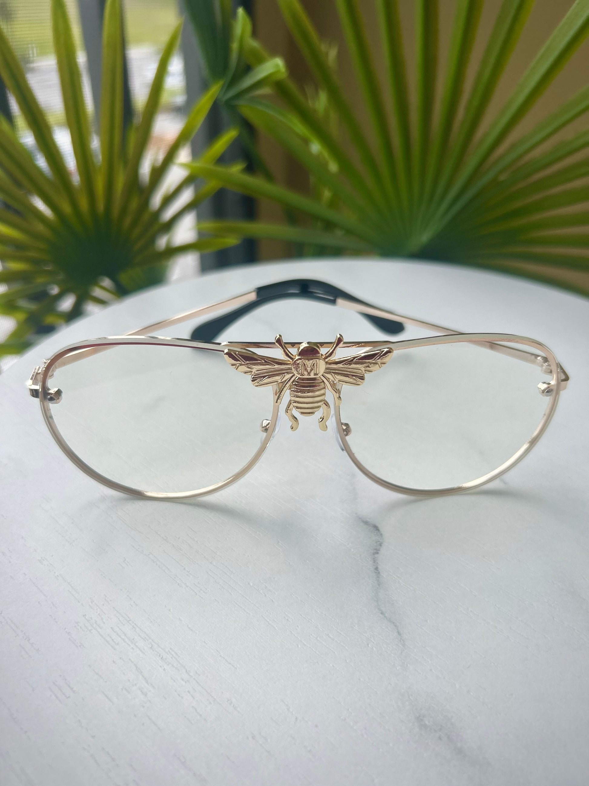 Bold. Iconic. The Bee aviators feature a gold-tone frame with a striking bee centerpiece that sets them apart. Clear non-prescription lenses make them perfect for everyday wear or standout styling.