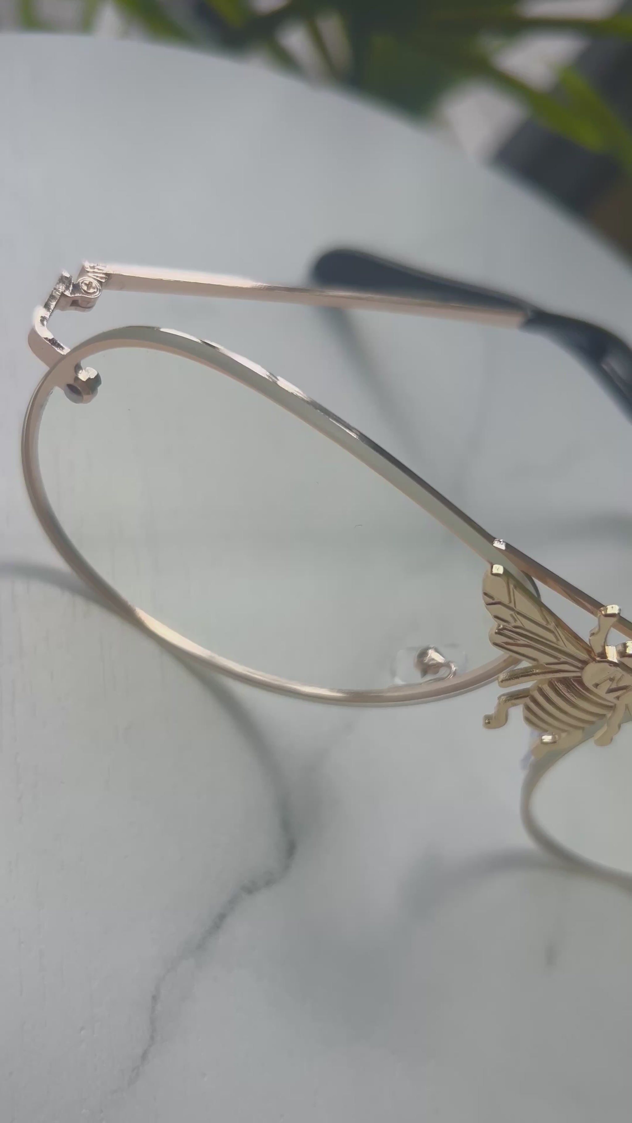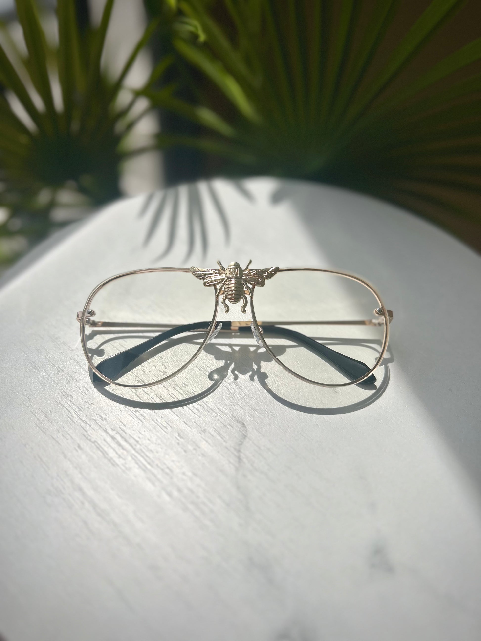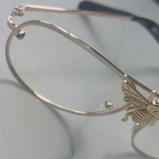 Bold. Iconic. The Bee aviators feature a gold-tone frame with a striking bee centerpiece that sets them apart. Clear non-prescription lenses make them perfect for everyday wear or standout styling.