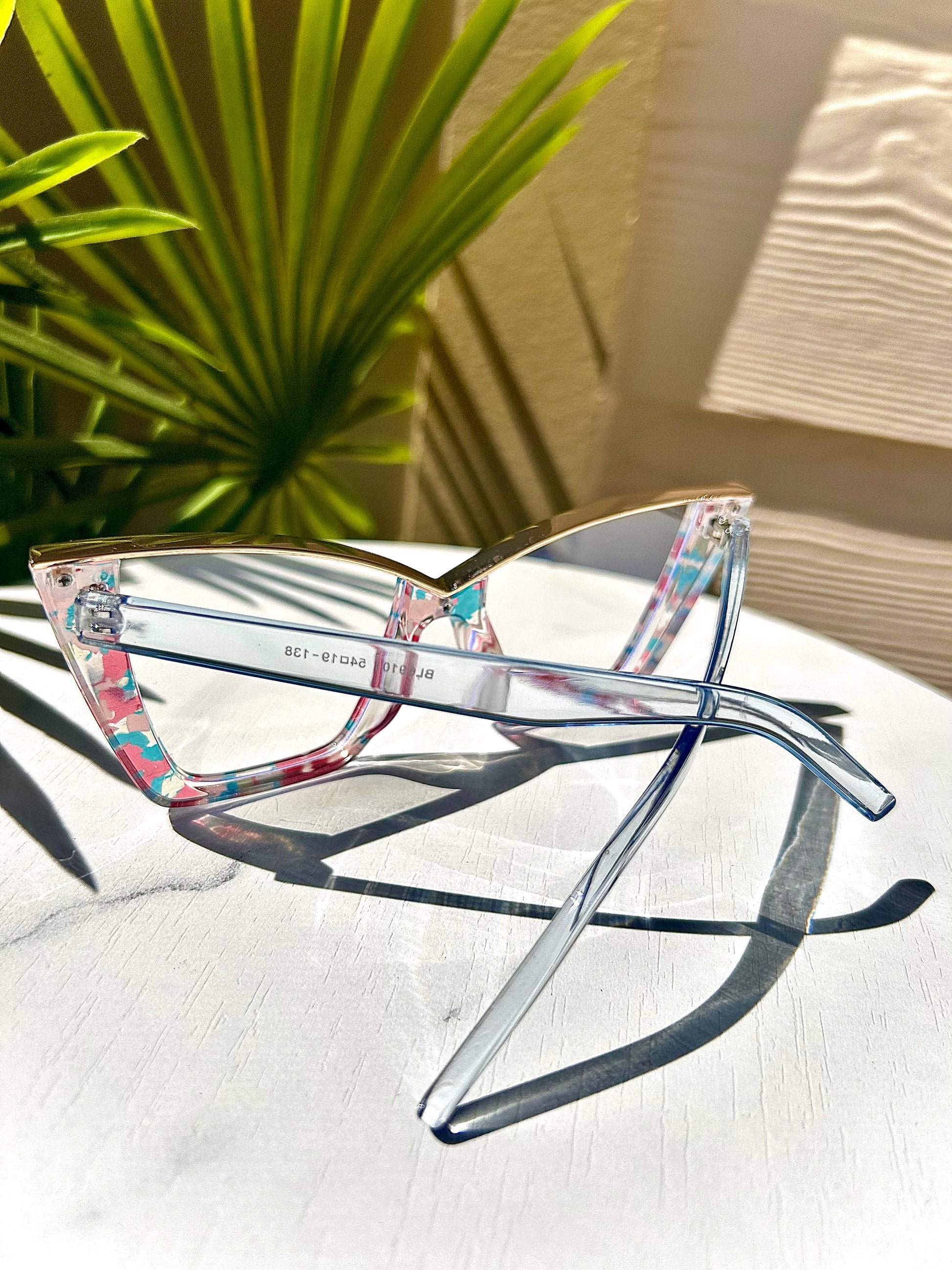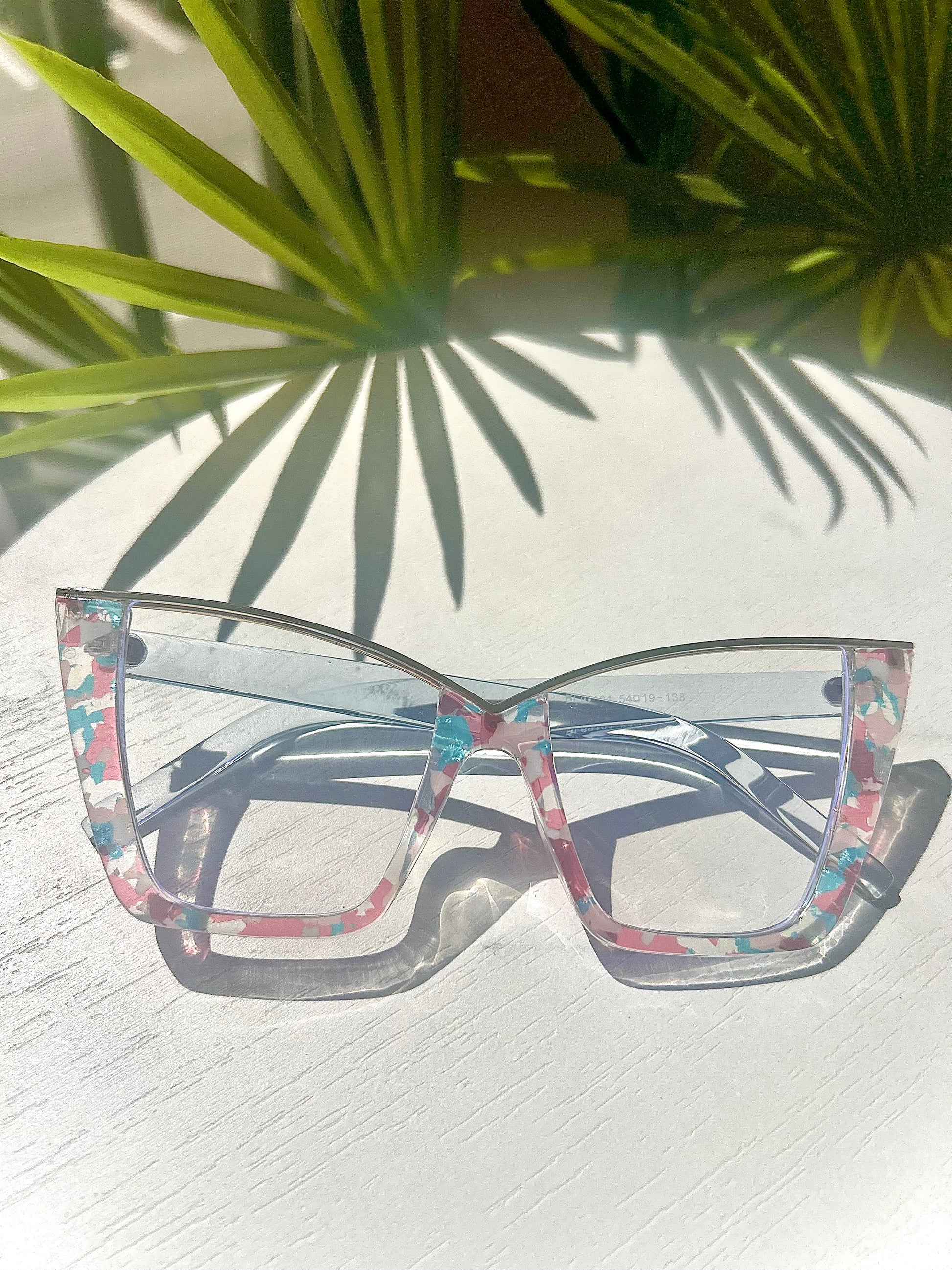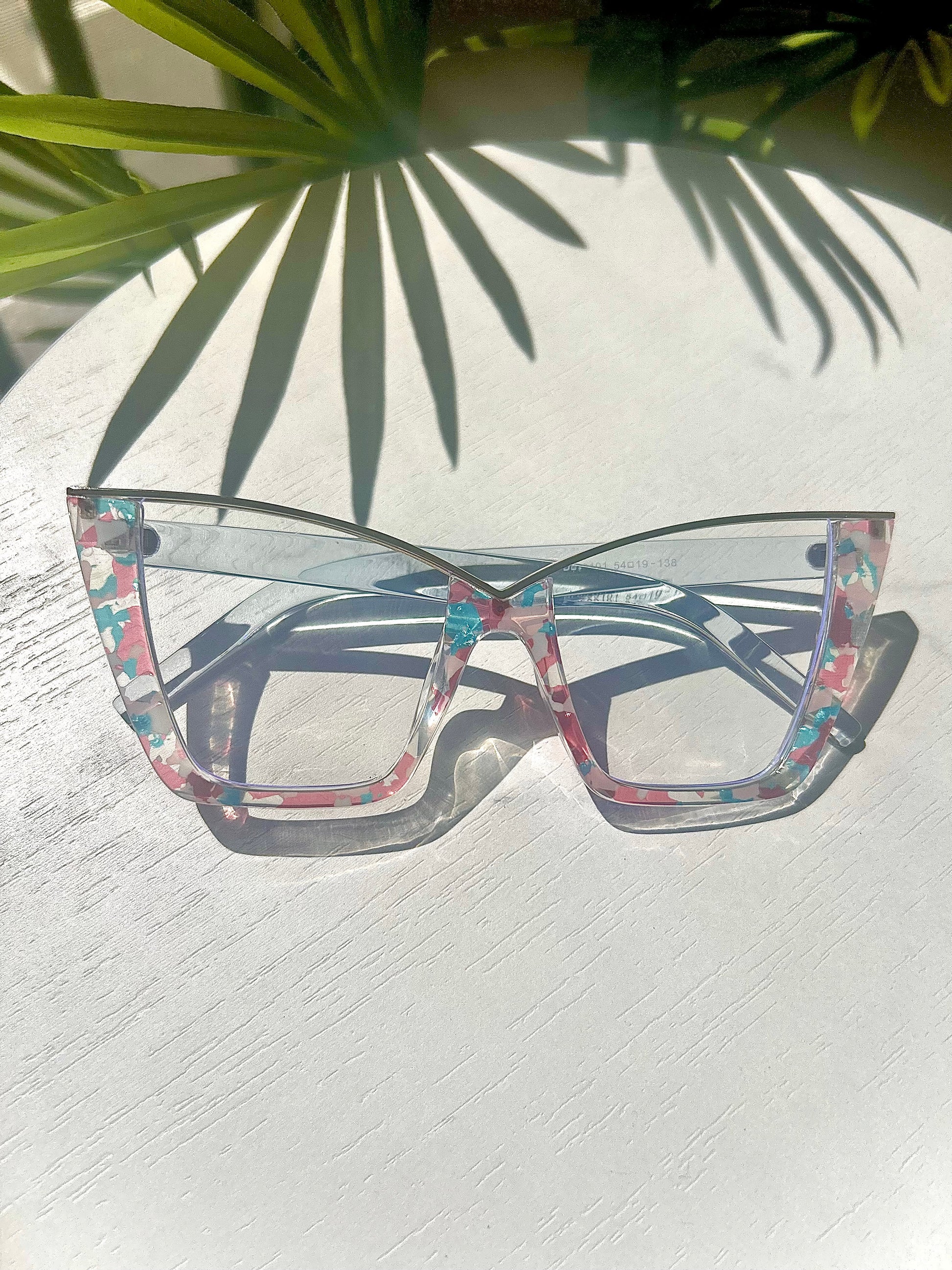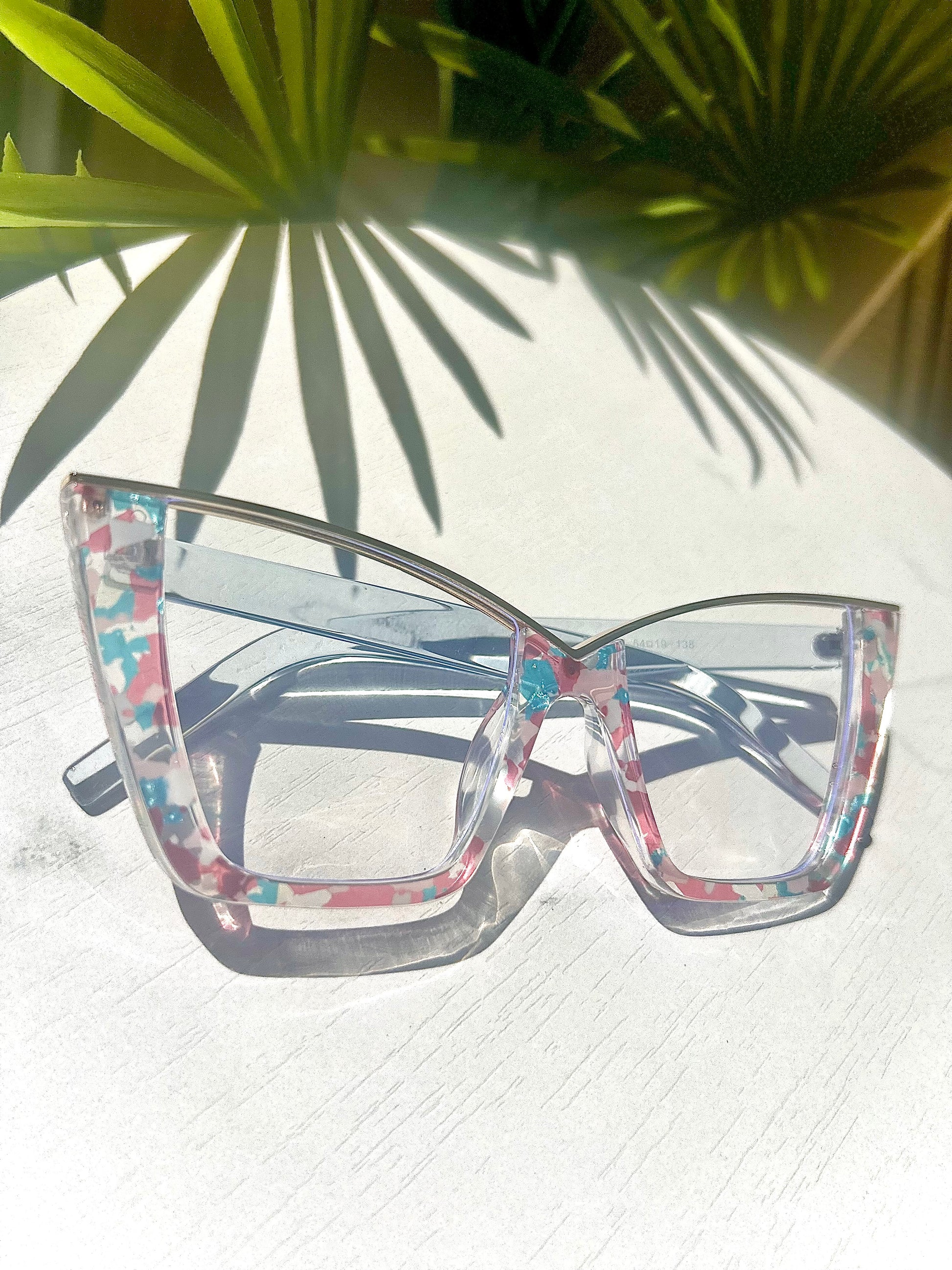 Turn heads with these oversized pink confetti cat-eye frames that mix bold style with everyday wearability. Designed with a clear lens, these fashion-forward glasses add instant personality to any outfit—whether you’re pairing them with casual fits or dressing up for a night out. Lightweight yet durable, they’re perfect for making a statement without sacrificing comfort.